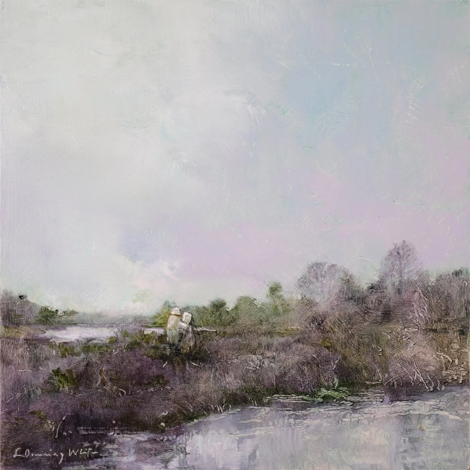 …artist canvas, remnants, and salvaged fabrics in natural fibers. I sew pieced fabric together with wool batting and a backing fabric—and then stitch them together on a longarm sewing machine. I print digital images made from my paintings and photos onto fabric, then stitch these images into my compositions. To create gradations of color, I paint on cloth with dyes and oil sticks. Sometimes I mask off a shape and paint during the quilting process. Often I will cover an image with stitching, in fact, painting with thread. I enjoy stitching with the freedom of drawing, finding inspiration in natural shapes, music, linear motifs in Asian and other art forms. These days, I am exploring ways to integrate stitching with my painting practice.